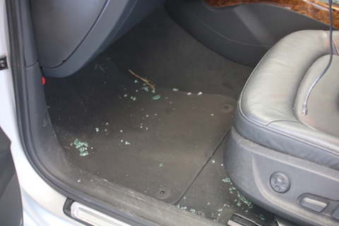 助手席側のガラスが割られ、車の中の荷物が取られてしまったそうです。