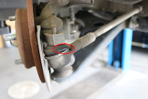 タイロットエンドブーツというタイヤのかじ取り部分、ブーツにヒビが入っています。破れてしまえば、中が錆びて、ハンドル操作出来なくなる重要部品。