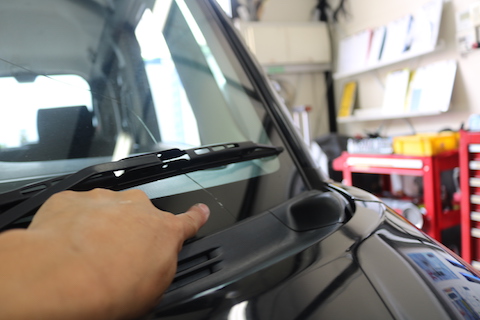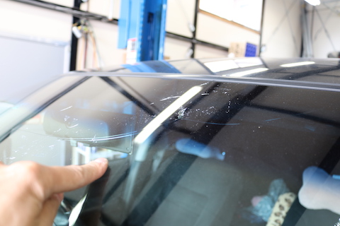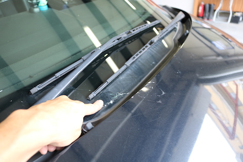 フロントガラス下側から伸びた傷。ここまで伸びると、ウインドリペアは出来ません。