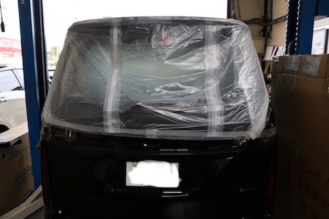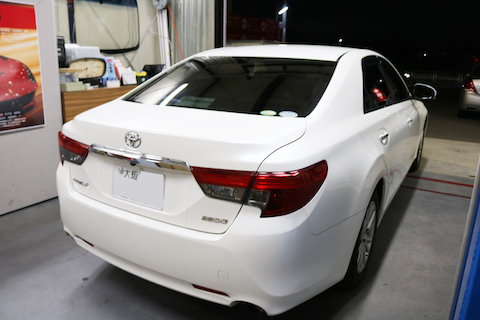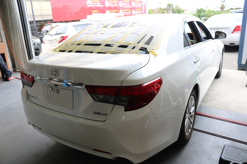 マークXのお客様、台風被害でリアガラスが破損!