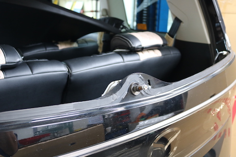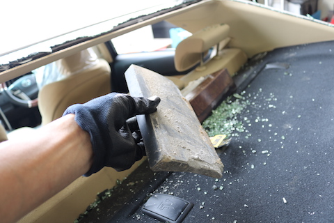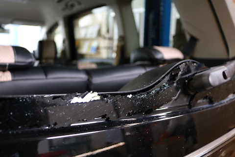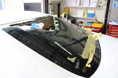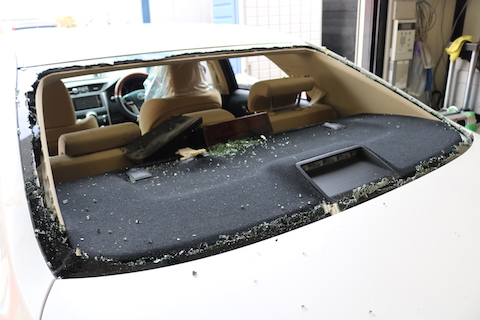リアガラスが破損して粉々。