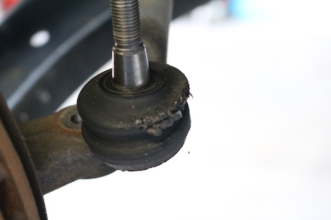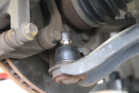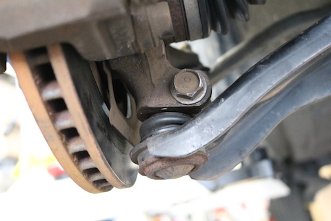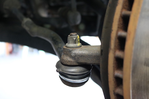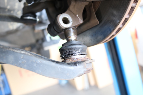 ハンドルの角度をタイヤに伝達するボールジョイント部分のブーツが破れて、グリスが漏れています。