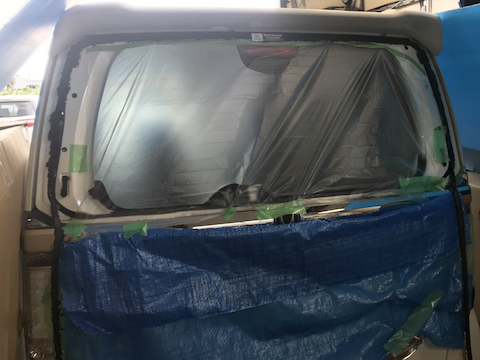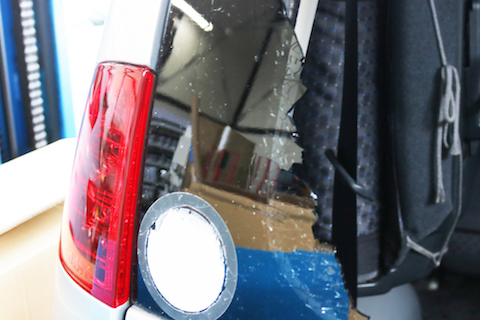 リアガラスが破損し、段ボールやブルーシートで保護されますが、これでは後ろが見えないので危険!しかも、雨漏りする可能性があります。