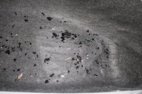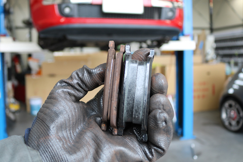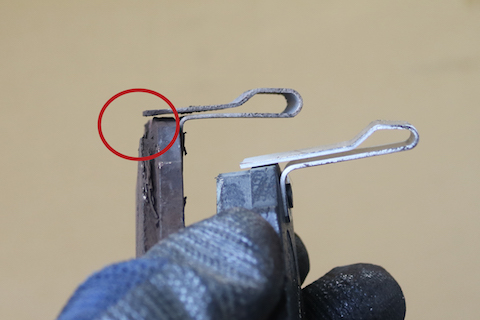 フロントパッド右側は、パッドセンサーの配線が切れてしまい、警告灯がついていました。左の新品パッドと比べても、厚みが全然違いますね!