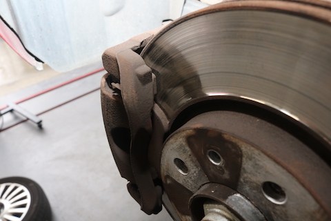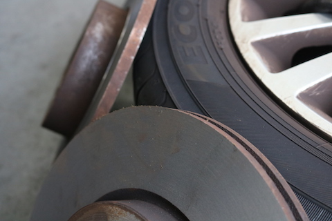 タイヤを外すと、ブレーキパッドは薄く、ローター表面は削れてデコボコ!