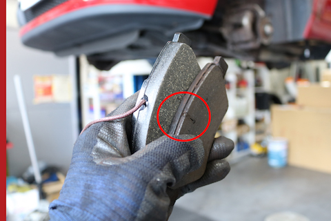 パッドには、なくなる手前で金属がローターに当たって異音を発生する機構がついています。