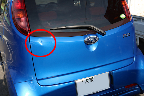 大阪府寝屋川市よりスバル R2のお客様、リアゲートに出来たヘコミ修理でご来店。