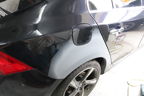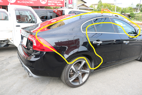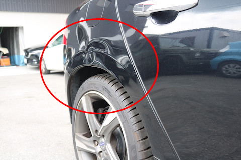 奈良県よりVOLVOのお客様、右後部分を大きくへこんでしまったとご来店。