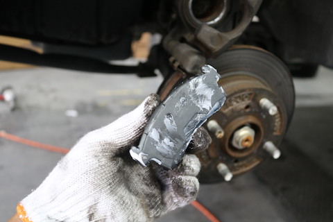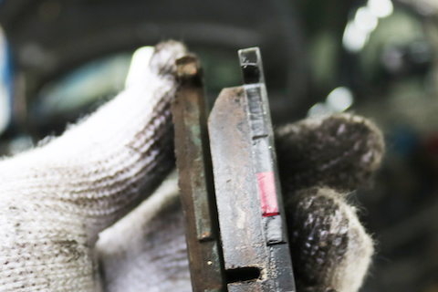 点検方法は、タイヤを外してブレーキパッドの厚みを測定します。