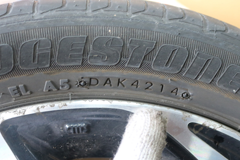 タイヤの製造年月が4214、42周目(10月頃)・2014年式。ゴムは古くなると固くなって、グリップ力が低下します。年数関係なく、ひび割れがあれば交換時期ですね。
