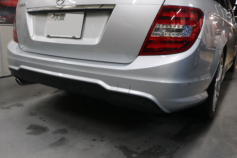 メルセデスベンツ C200のリピーター様、リアバンパー部分のヘコミと傷修理でご来店。