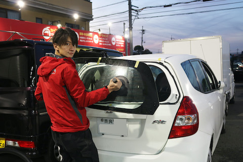 奈良県よりフィットのお客様、リアガラスを当ててしまったと緊急入庫。