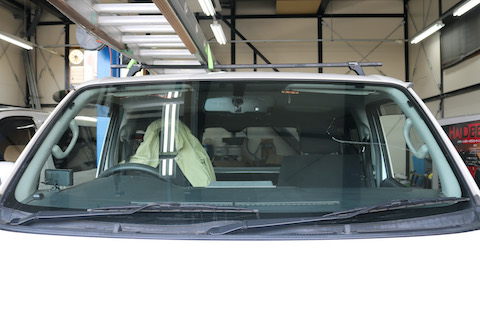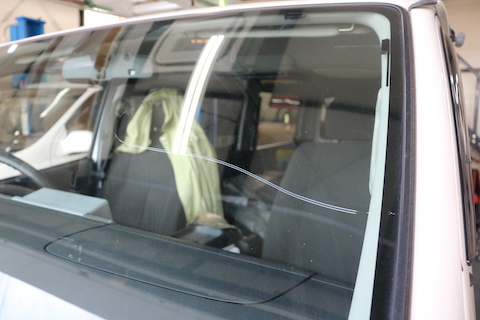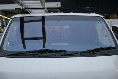 トヨタ ハイエースのお客様、フロントガラスに大きくヒビが入ってしまい、ガラス交換のご依頼を頂きました。