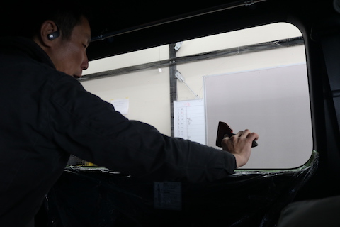 カーフィルムとは、特殊な黒いフィルムをガラスに貼り付ける作業で、