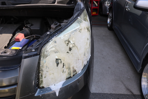 ヘッドライト表面に、専用の液剤で汚れを除去し、