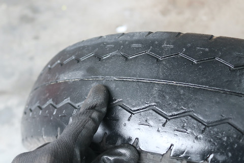 こちらのタイヤですが、タイヤの溝点検する為のスリップサインが表面に出てきているので、車検に合格しません。