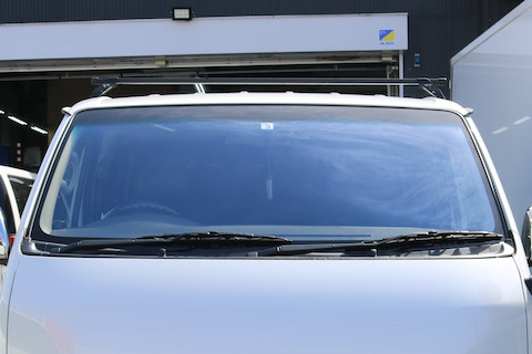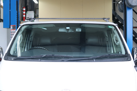 青色に輝くフロントガラス、ハイエースに似合います。