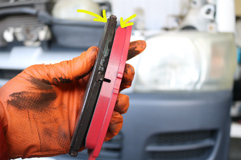 ハイエースのブレーキパッド、黄色の矢印部分がパッド残量。