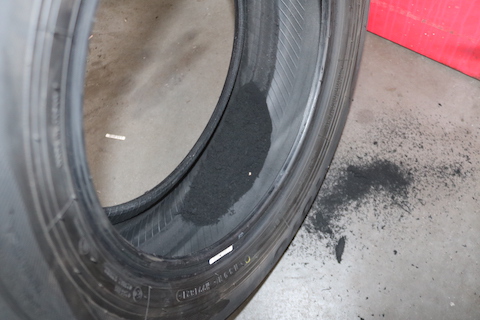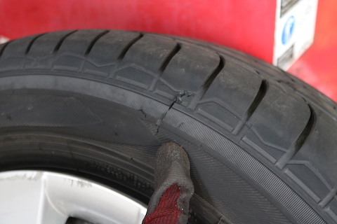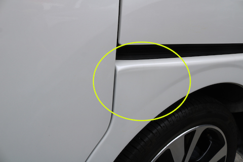 今回は左タイヤ上あたりのヘコミと塗装割れ補修のご依頼。