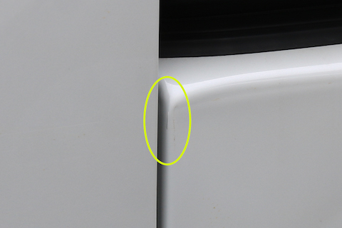 ヘコミにより、角部分の塗装が割れて、鉄板が見えています。