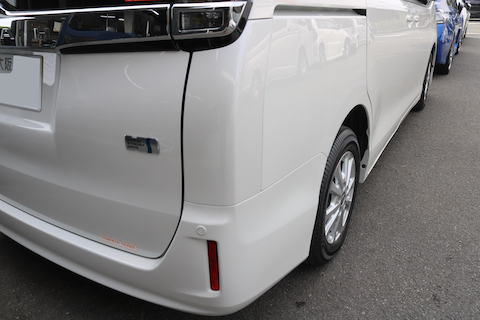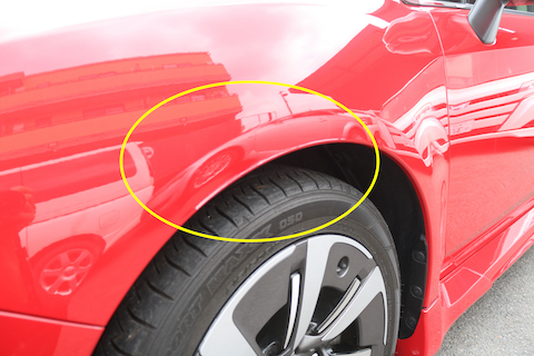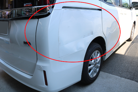 右リアタイヤ上あたりのパネル前面が大きくへこみ、傷もついています。