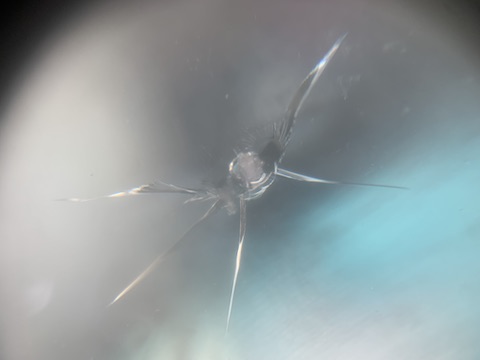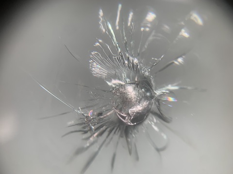 小さな飛び石の割れから、傷が伸びてガラス交換となってしまいます。