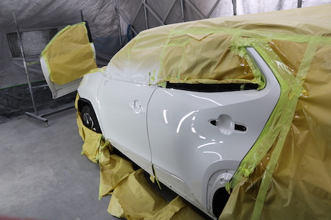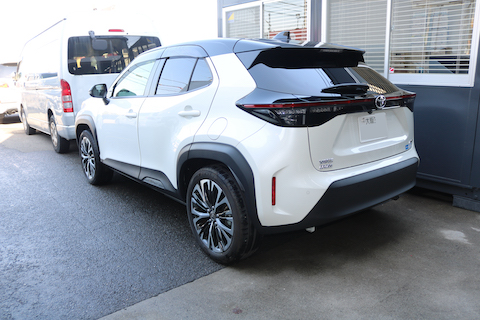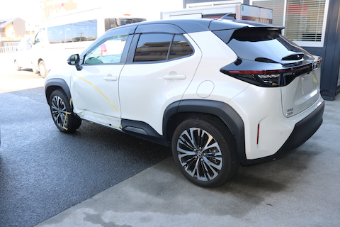 ヤリスクロスのお客様、左フロントドア部分を大きく損傷してしまったとご相談。