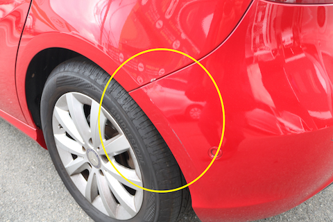 タイヤ上のパネルとリアバンパー部分の修理が必要。