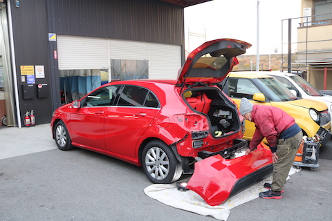 ベンツAクラスのお客様、リアバンパーとリアタイヤ上あたりに傷が出来てしまったとご相談。