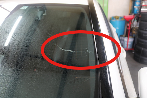 助手席側に飛び石被害でヒビが大きく伸びており、