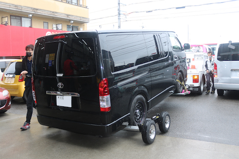 ギリギリで避けたけど、歩道の縁石に乗り上げてしまったと緊急入庫したハイエース。