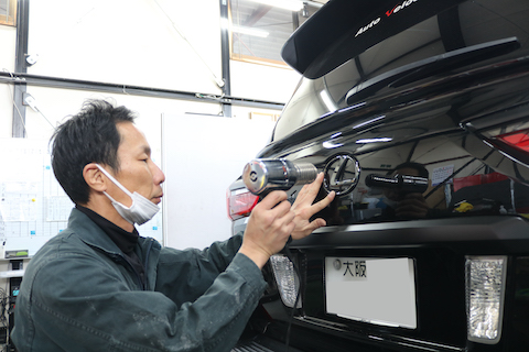 新しいエンブレムを取り付け。テープを温めながら貼り付ける事で粘着力アップ。
