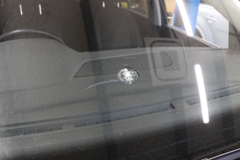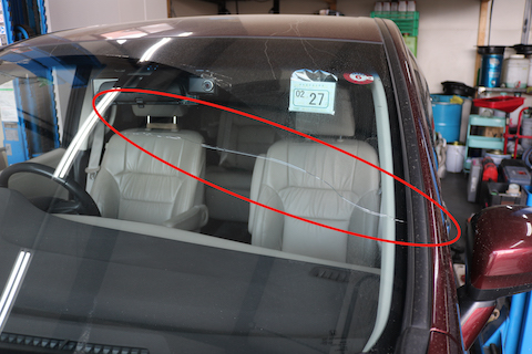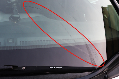 フロントガラス上部分から大きく亀裂が入っており、