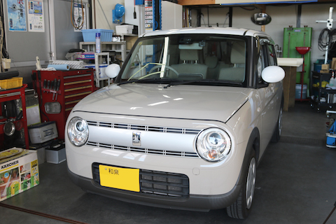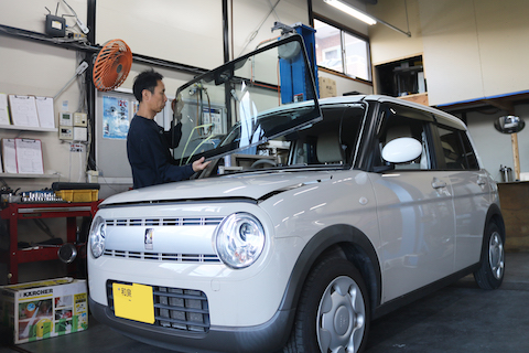 ラパンのフロントガラス交換、カメラ調整(エーミング)対応!