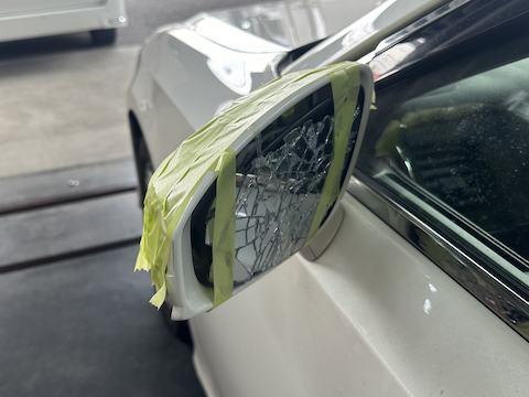 ドアミラー正面を当てて、90度回転し、窓ガラスに当たっている状態でした。