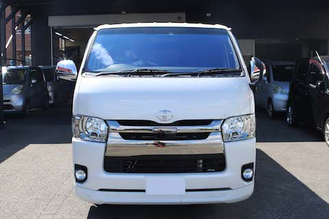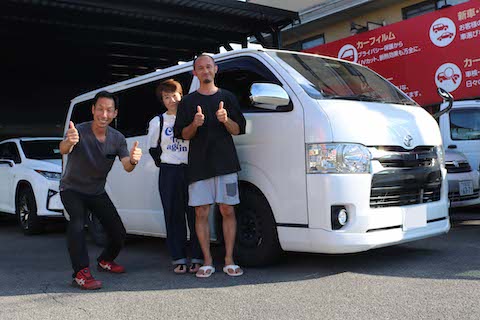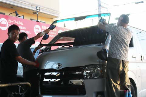 ハイエースのお客様、フロントガラスを青色に変更して、