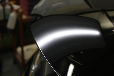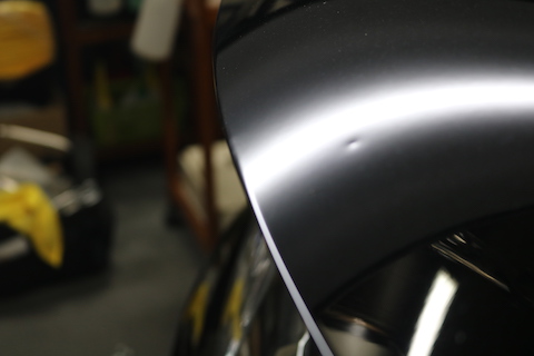 今回はへこみの大きさから、デントリペアという技術(へこみの裏側から専用工具で押し出して直します。だから、パテもしませんし、再塗装もしません)で完全復活させました。