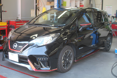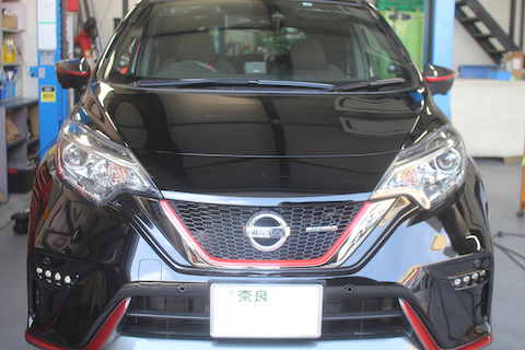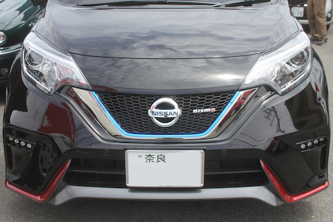 ノート E-powerのワンポイントである、ブルーメッキ。お客様はこのブルーを変えたいというお悩みでした。メッキなので、塗装ではうまくひっつかないし、後々剥がれることもありますが・・・