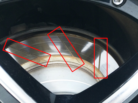 ここにパッド新品のパッドをつけても、デコボコ面にはパッドが合わずに、ブレーキ力低下につながります。