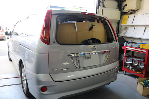 奈良県よりニッサンプレサージュのお客様、学校からボールが飛んできて、リアガラスが破損!