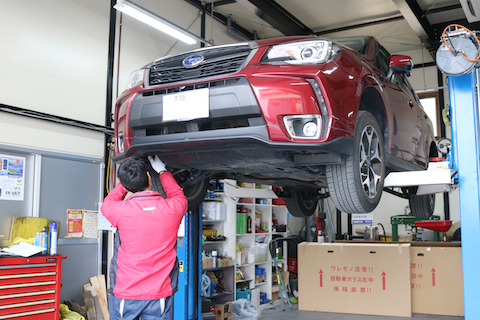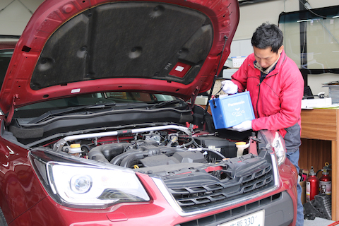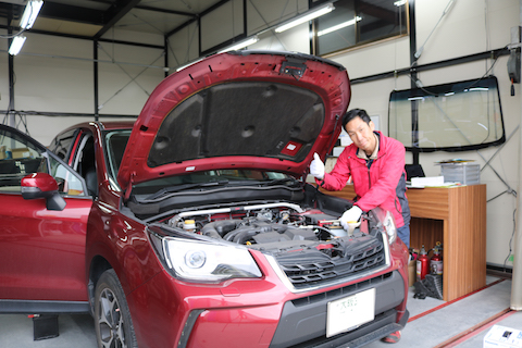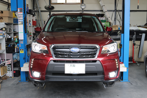 大阪府交野市よりスバル フォレスターのお客様、バッテリーとフォルランプ球取替でご来店。