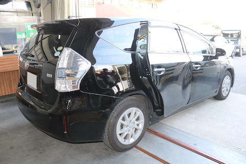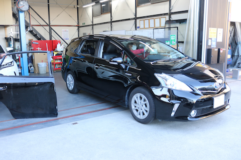 プリウスのお客様、ドアが閉まらないほど大きく損傷してしまったと緊急入庫。