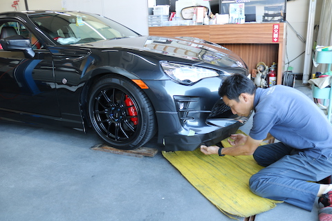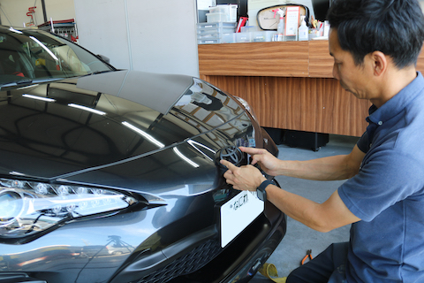 フロントバンパーのメッキ部分をカーボンブラックにしたいとのご依頼。