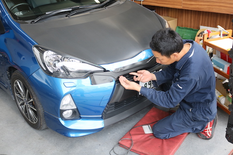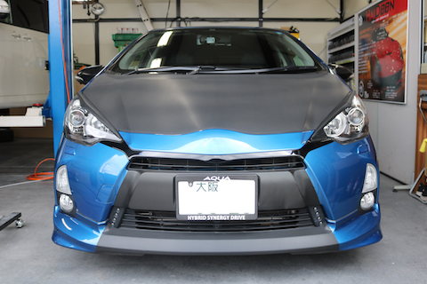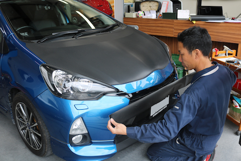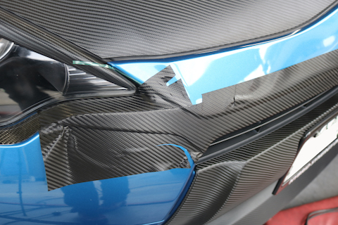 すでにボンネットやバンパー部分にカーボンブラックラッピングしているのですが、