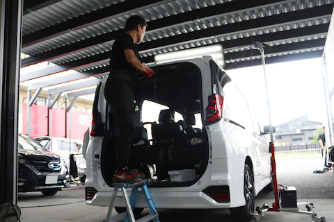 リアゲートがあると、へこみまでの距離が遠いので、外して凹みに近づいての作業。
