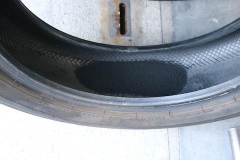 これは、ぺっちゃんこのタイヤで走っていた跡。これは修理できない危険信号!