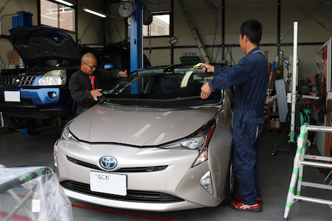 大阪市より新車で納車したばかりのプリウス、台風被害でフロントガラス破損。