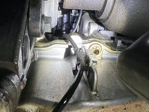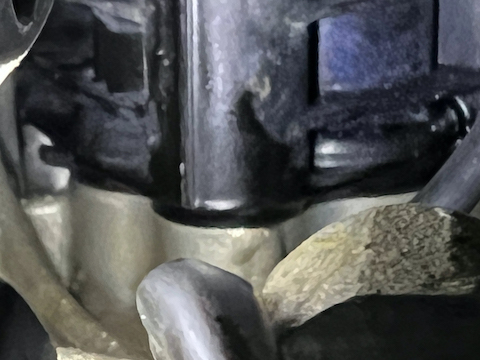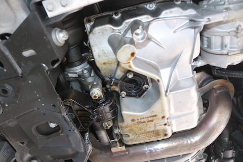 カバーを外すと、エンジンにオイルが垂れてますね。