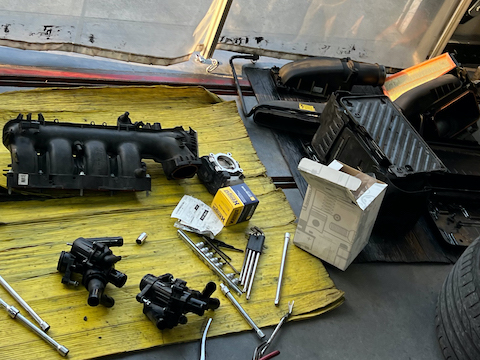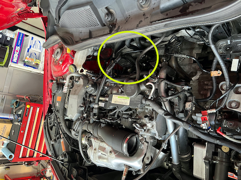 エンジン上からいろんな部品を外して、奥側に手を入れての作業。
