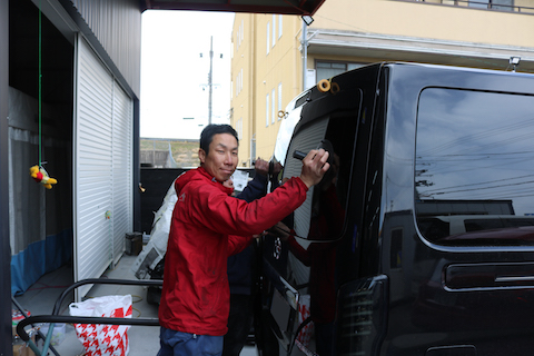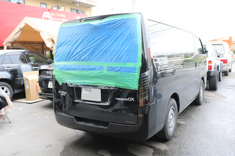 大阪府寝屋川市よりキャラバンのお客様、リアガラス破損で緊急入庫!